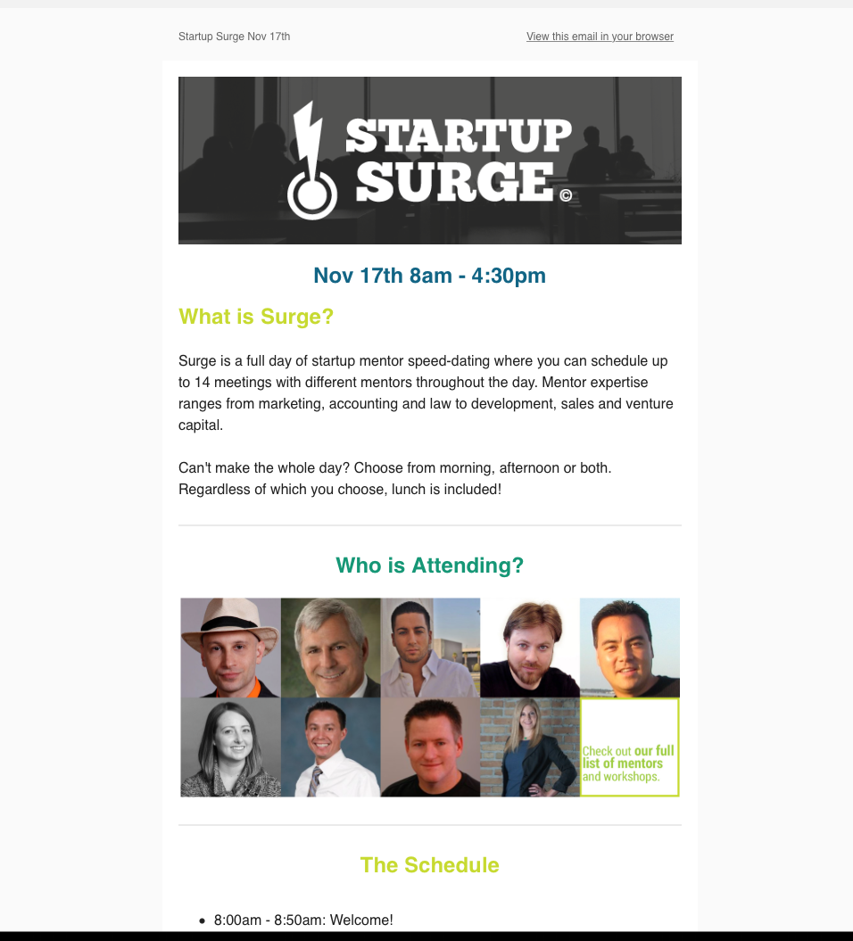 My job was to ensure proper branding for the Startup Workshop Series in EMail campaigns. I also led the project of merging and converting their Email distribution list from Batchbook to Mailchimp in a way that would benefit the WaVE.